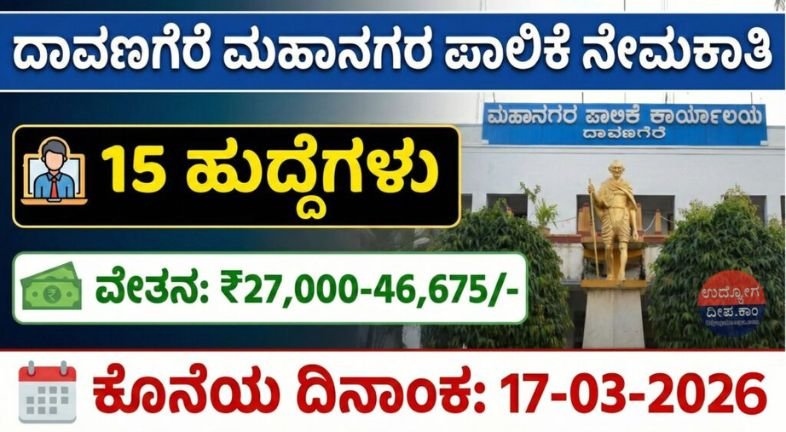 ದಾವಣಗೆರೆ ಮಹಾನಗರ ಪಾಲಿಕೆ ನೇಮಕಾತಿ 2026: ₹46,675 ಸಂಬಳ! 15 ಹುದ್ದೆಗಳಿಗೆ ಅರ್ಜಿ ಆಹ್ವಾನ
